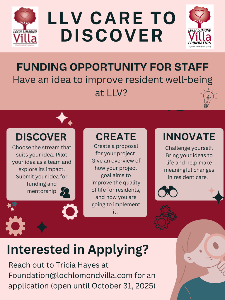 Currently, the Loch Lomond Villa Foundation and Research Department are excited to launch a new initiative called Discover to Care. The project is designed to support innovative initiatives that enhance the quality of life for both our residents and their families. This grant invites Loch Lomond Villa staff to submit pilot project proposals focused on creative and impactful solutions.